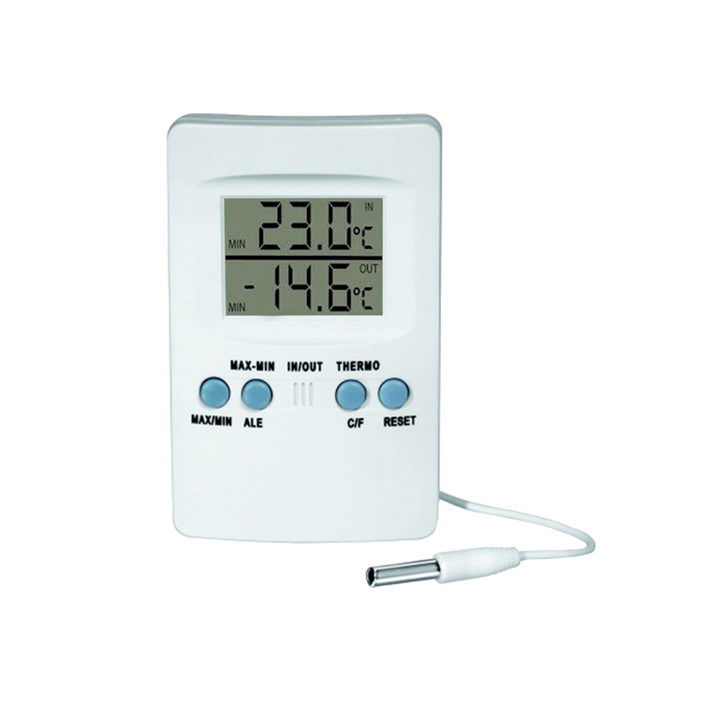 O termômetro digital da J.Prolab é um tipo de termômetro de fácil medição que possui um sensor de temperatura interno (IN) e um sensor de temperatura externo (OUT).